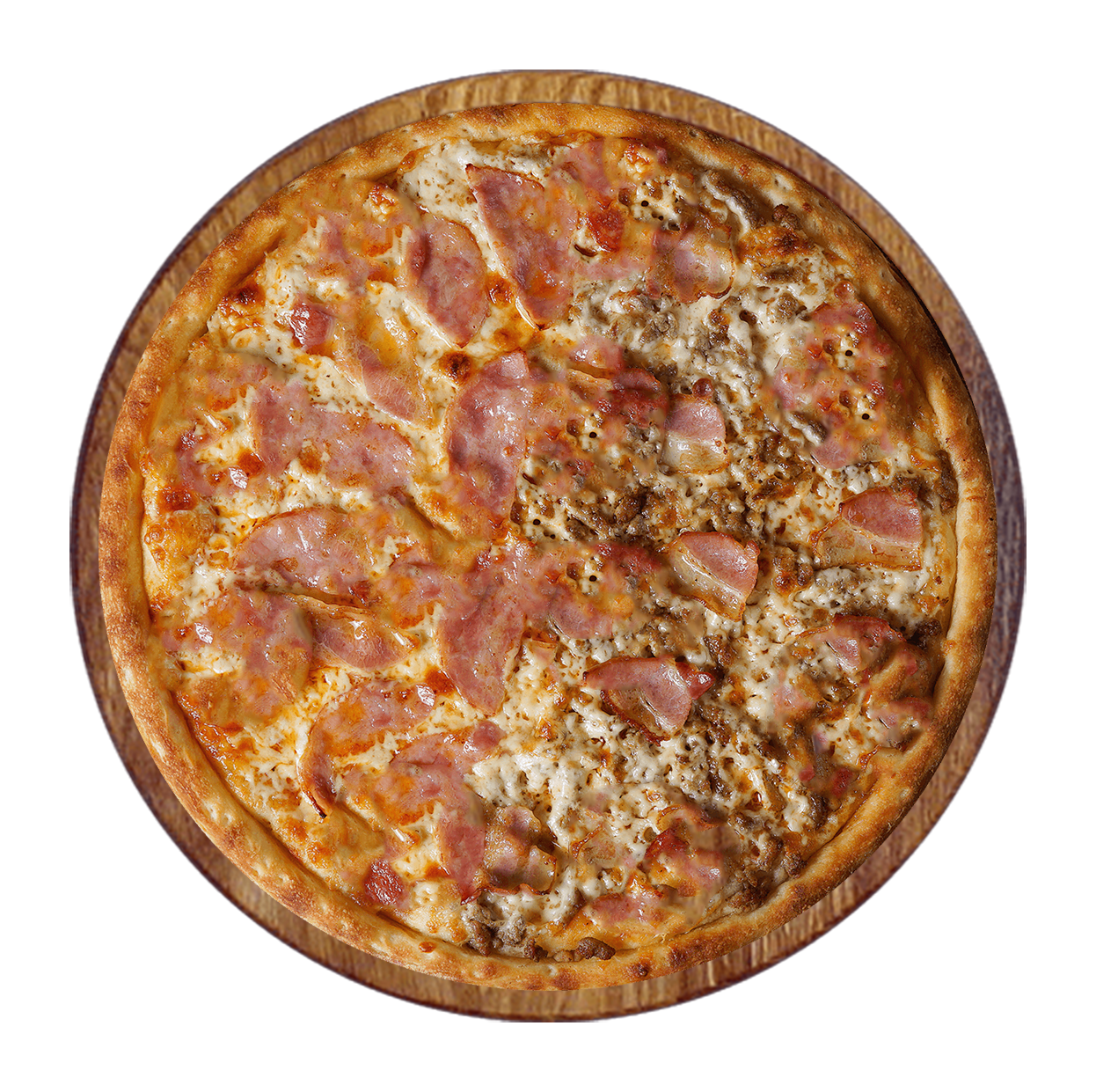 Sauce tomate, mozzarella, viande hachée, bacon, oignons, sauce barbecue.