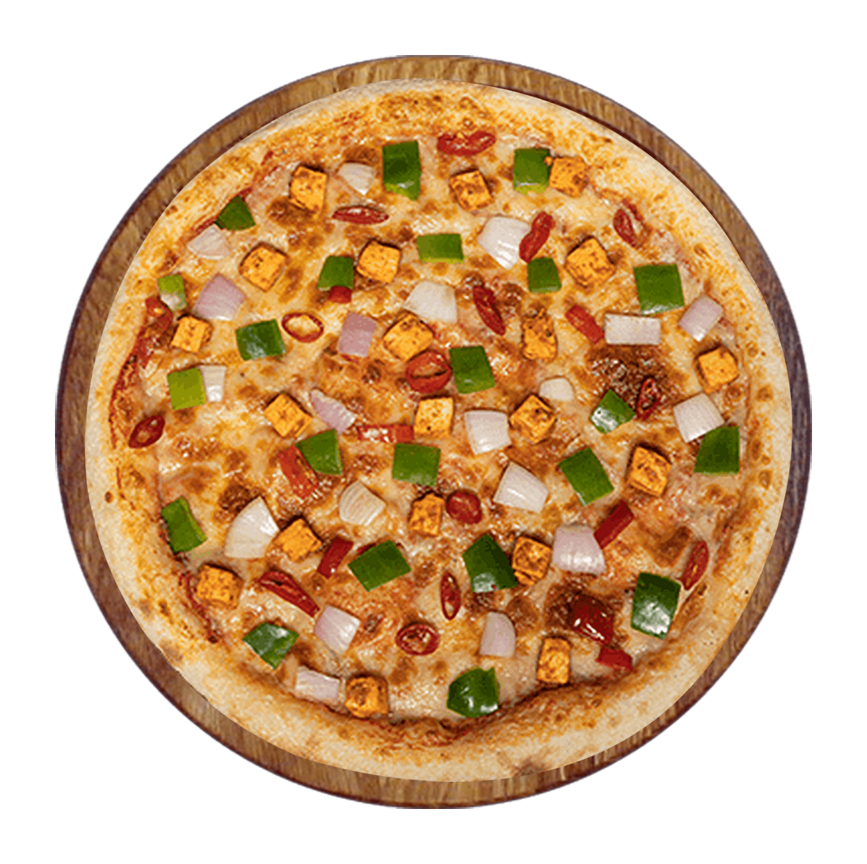 Sauce tomate, mozzarella, poulet, poivrons, oignons, sauce curry.