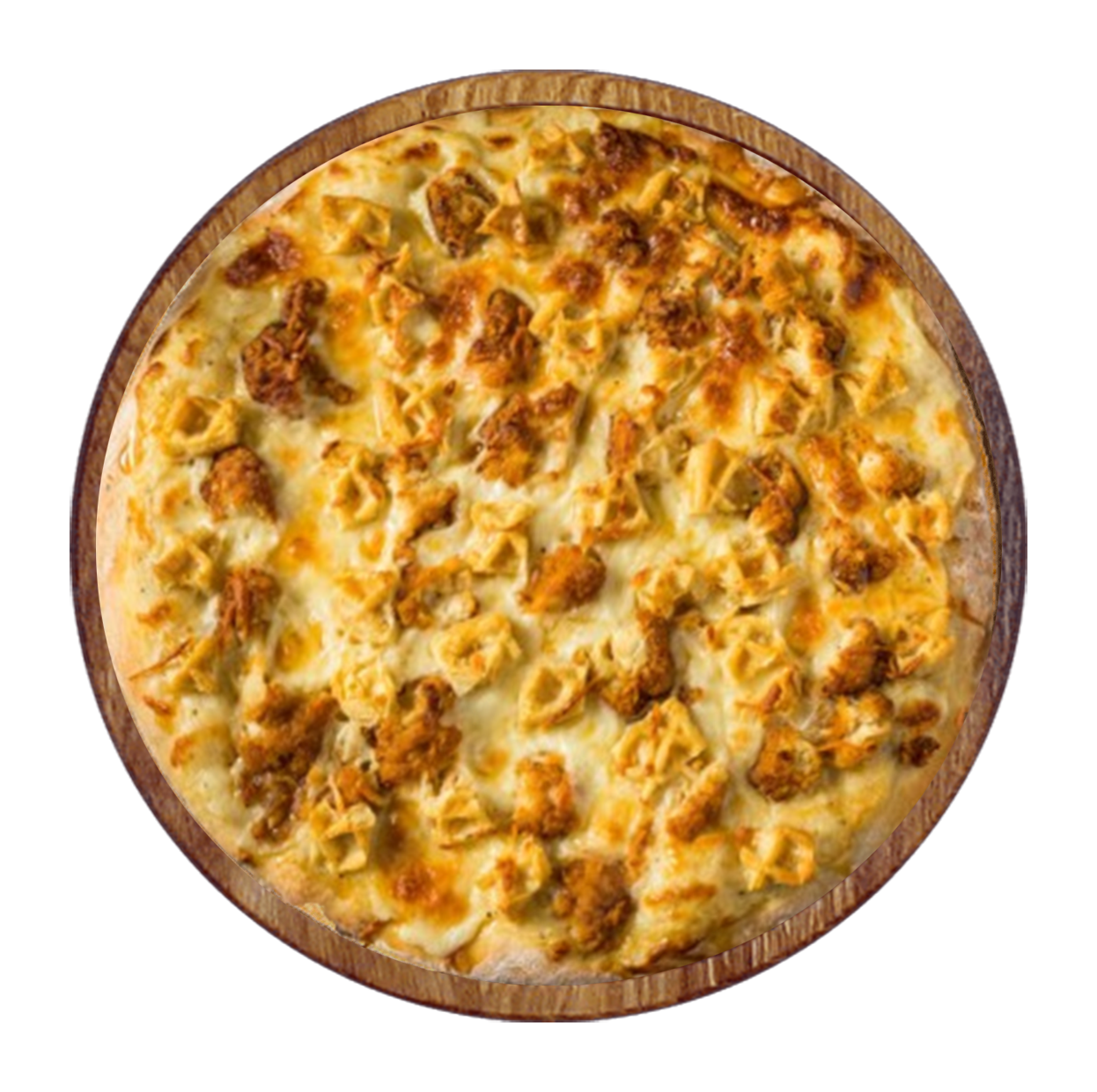 Crème fraîche, mozzarella, tenders, cordon bleu, oignons crispy, sauce fromagère.